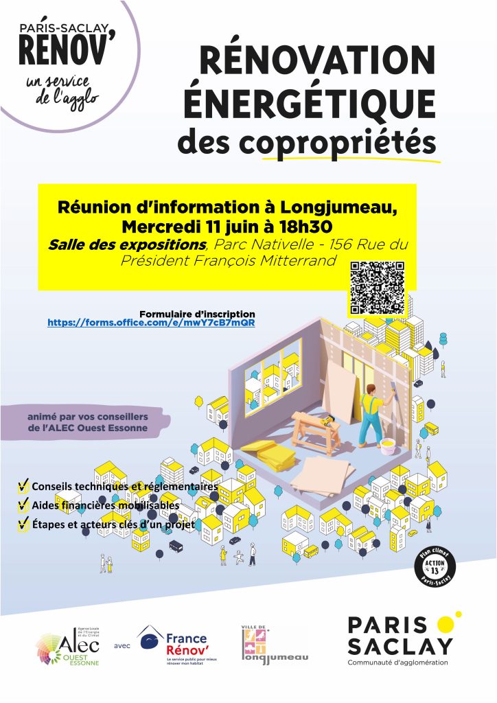 Rénover une copropriété, mission impossible ? Paris-Saclay Rénov’, déclinaison locale de France Rénov’, vous invite à Longjumeau pour une réunion d’information dédiée à la rénovation énergétique des copropriétés le mercredi 11 juin à 18h30 Salle des expositions, Parc Nativelle.