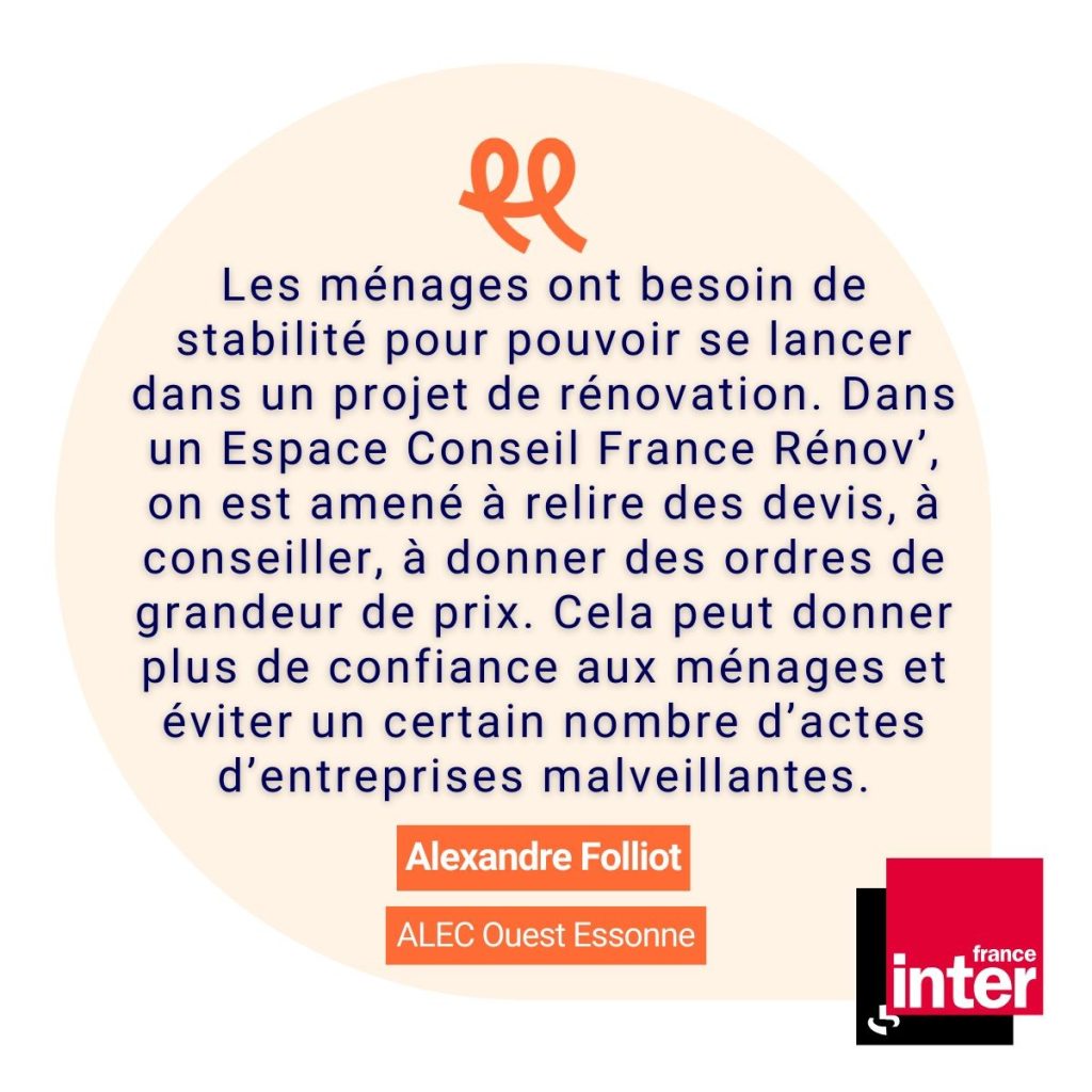 Pour illustrer concrètement ce que représente ce rendez-vous obligatoire, Sandy Dauphin, journaliste chez France Inter a assisté à un entretien d’accompagnement au sein de l’ALEC Ouest Essonne. Diffusé dans la matinale, ce reportage met en lumière le rôle déterminant des conseillers dans la sécurisation des parcours.